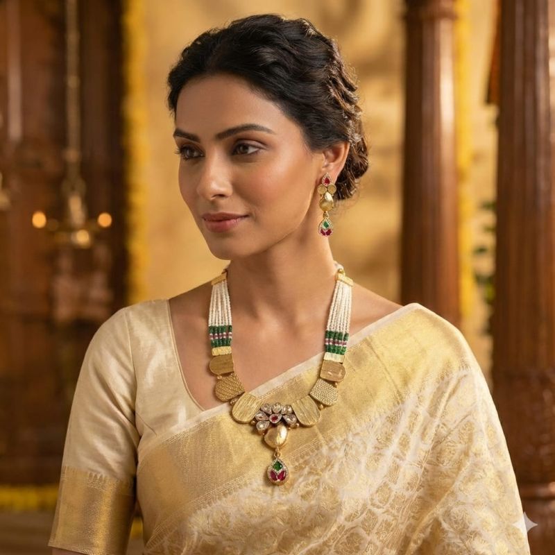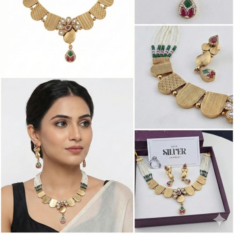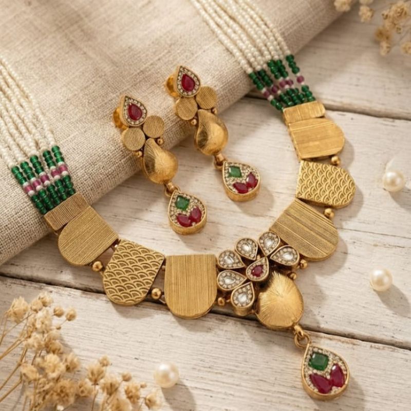 फ्लोरल मोटिफ डिज़ाइन और पर्ल स्ट्रैंड्स के साथ तैयार यह नेकलेस सेट ट्रेडिशन और एलिगेंस का सुंदर संगम है।